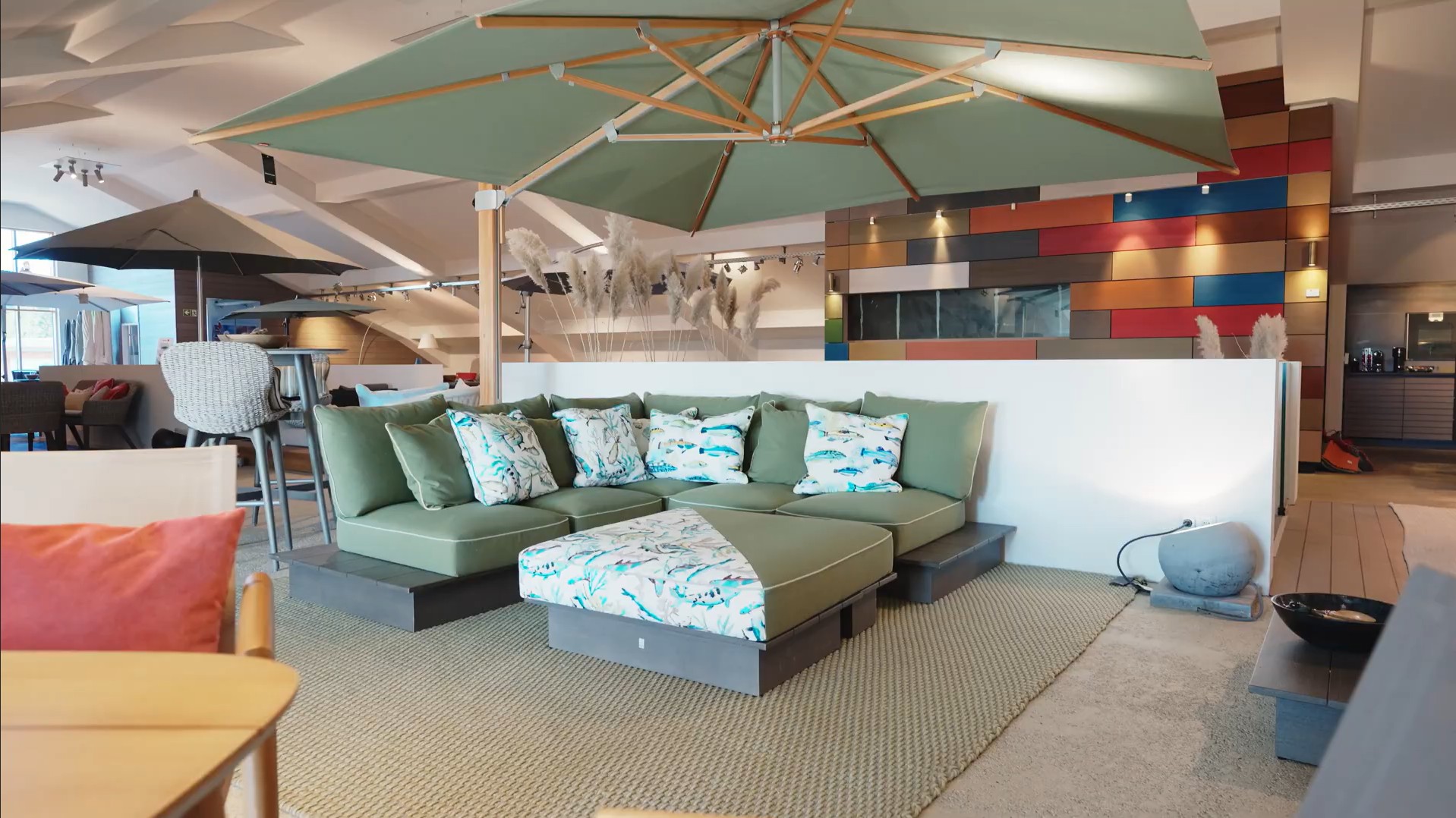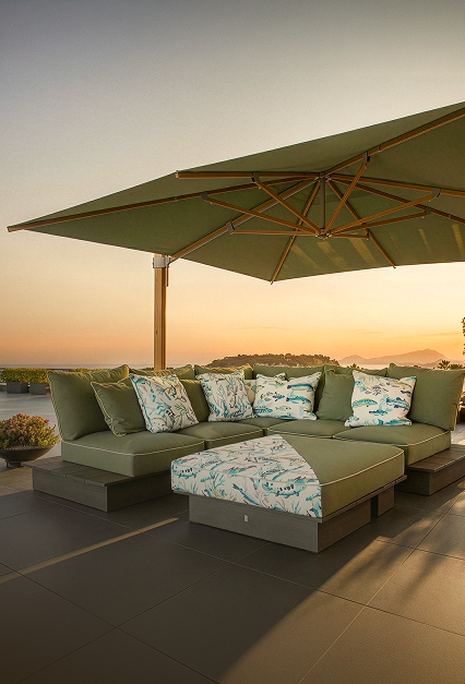 Exklusive Gartenmöbel, handgefertigte Kissen und hochwertige Sonnenschirme.